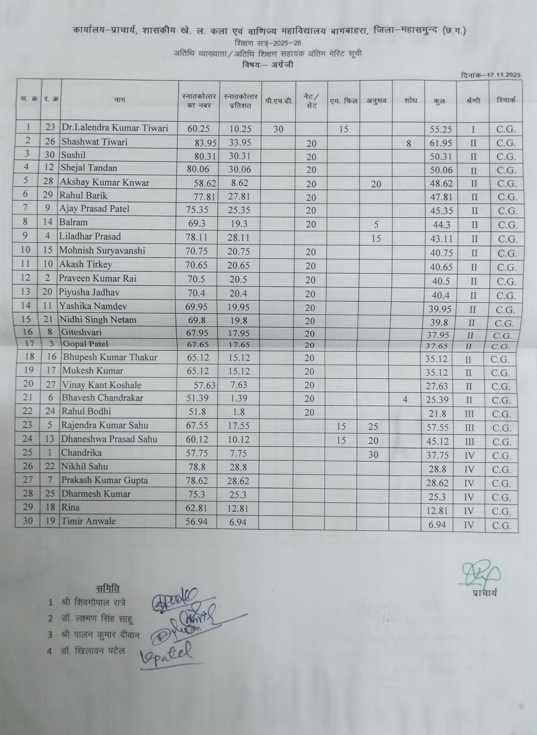 दावा आपत्ति हेतु अतिथि व्याख्याता/अतिथि सहायक शिक्षक मेरिट सूची रसायन शास्त्र (बागबाहरा महाविद्यालय)