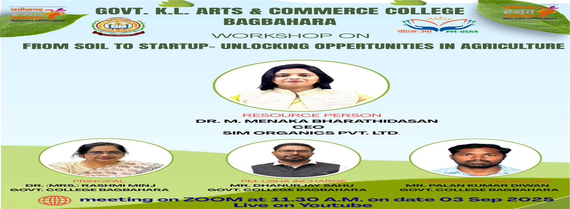 I, foremost, thank you for considering the opportunity to study at the Govt K.L. Arts AND Commerce College, Bagbahara to achieve your career goals. It is my pleasure to make certain that our institute operates according to the changing needs of the times. Read More
